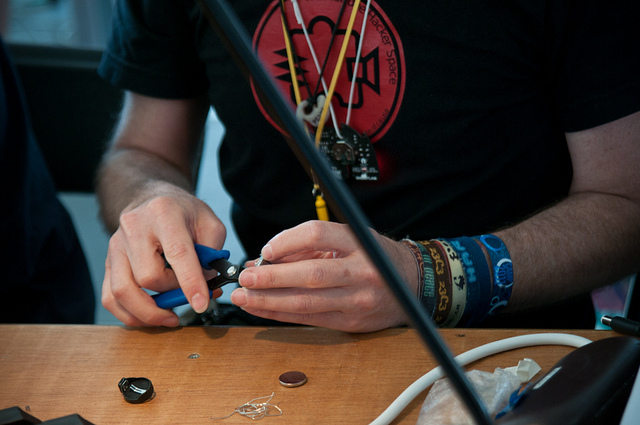 Mitch Altman, hacker historique, s’emballait lors du dernier Chaos Communication Camp, le plus grand rassemblement européen de hackers, qui s’est tenu début août : « un hackerspace, c’est un endroit comme ici où les gens partagent leurs savoirs et leurs passions et s’inspirent les uns des autres. » Et il ne faisait pas que s’emballer en théorie : l’homme animait un atelier de soudure pour les enfants où, tous ensemble, sous la houlette des adultes, ont mené à bien un petit projet. Inventeur de la célèbre TV-B-Gone (une télécommande universelle dotée d’un seul bouton : le OFF) et co-fondateur de Noisebridge, célèbre hackerspace, Mitch Altman promène ainsi sa tignasse multicolore dans les hackerspaces du monde entier pour apprendre aux gens les charmes du DIY.