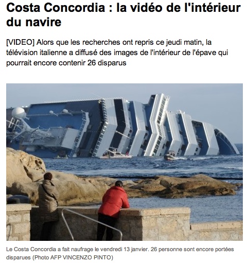 Une vidéo filmée par un père de famille est bien venue illustrer la panique vécue par les passagers, mais ce n’est finalement pas cette option vernaculaire qui a été majoritairement retenue par la presse en ligne, qui est restée fixée sur l’épave, vue sous tous les angles, avec à la base de la perspective, du côté du spectateur, le plus souvent, un bout de terre ferme, une maison ou même un spectateur tiers. Et même cette image-ci qui a fait surface mercredi 25 janvier par l’intermédiaire de l’agence AP et qui pouvait avoir un caractère “informatif” puisqu’il s’agit d’une vue de l’événement, n’a pas été reprise dans la presse française (je ne l’ai trouvée que chez Paris-Match) alors qu’elle l’a été assez largement dans la presse anglo-saxone… Elle met le spectateur dans une position de voyeurisme plus délicate et interdit toute délectation devant le spectacle de la grande maison en train de sombrer… Or ce qui est en jeu ici, ce ne sont pas les victimes, mais la vulnérabilité et le gigantisme du navire… pas la détresse des passagers…