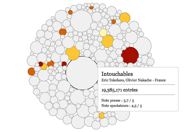 Il y a quelques semaines, alors que twitter résonnait de débats passionnants sur l’état de la météo au dessus de la Croisette, Jean Abbiateci sortait tranquillement une visualisation bien utile, judicieusement nommée “Box-Office : le cinéma français mis en bulles”.