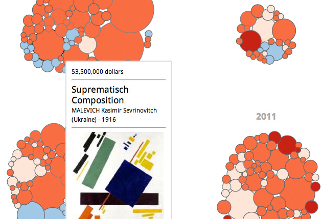 Jean Abbiateci, sur sa lancée, a poursuivi son jeu de bulles pour visualiser le marché de l’art. Cette fois-ci ce sont les 270 oeuvres vendues qui ont atteint des sommets aux enchères, entre 2008 et 2011 qui sont présentées.