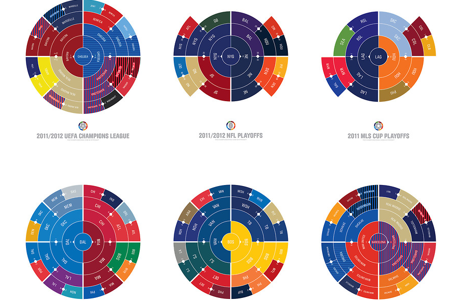 Commençons par un coup d’Å“il sur les championnats des années passées. Hyperakt revient sur les matchs de l’UEFA, de la NBA et autres ligues sous forme de cibles.  Chaque “secteur” de la cible représente une équipe à laquelle une couleur est attribuée. Un petit losange blanc marque les affrontements entre les clubs. L’équipe gagnante progresse ensuite vers le centre de la cible.